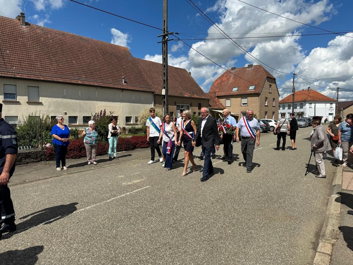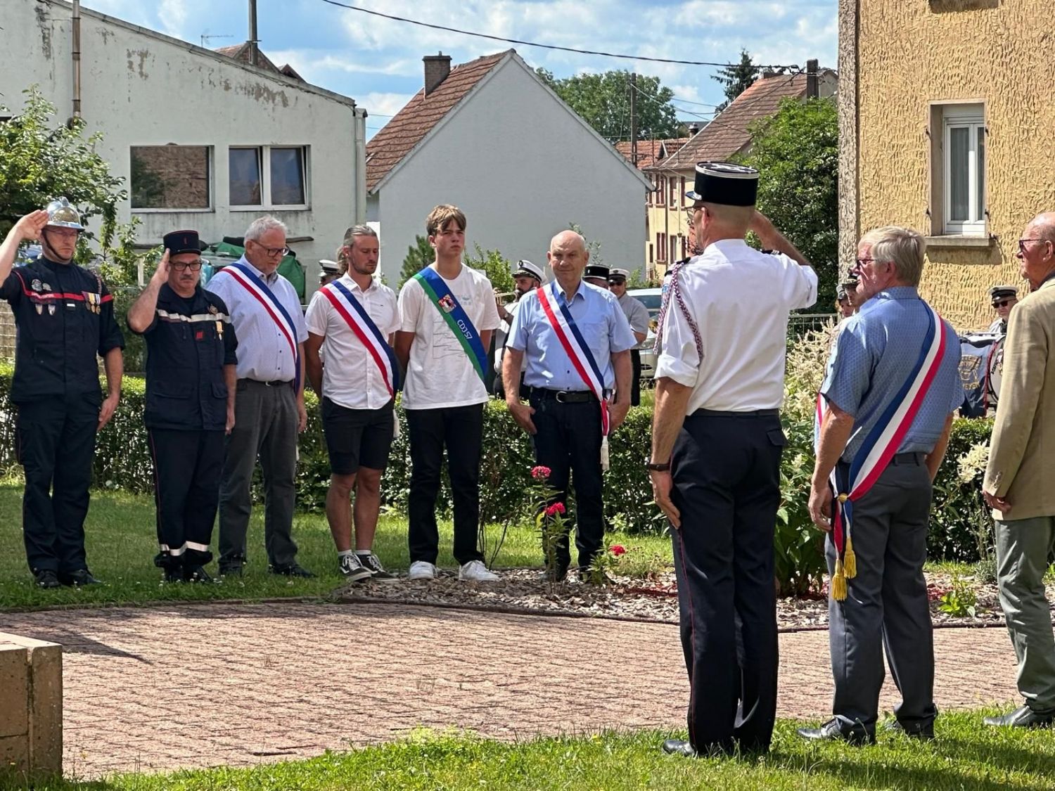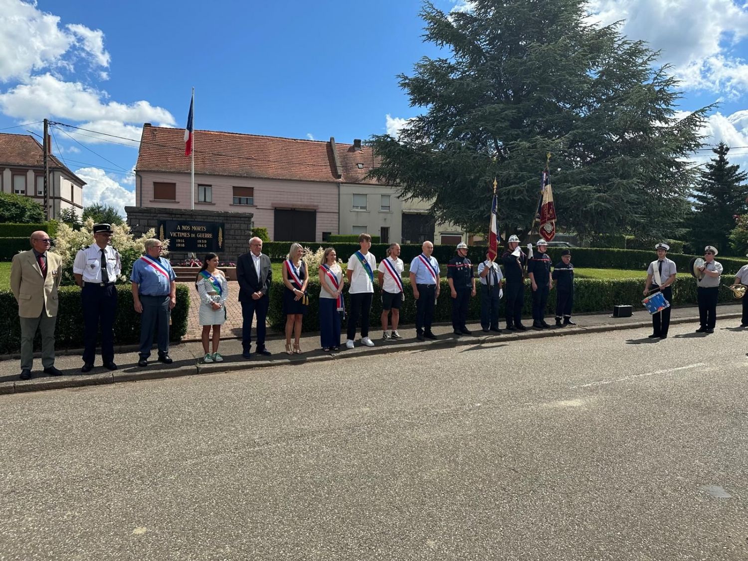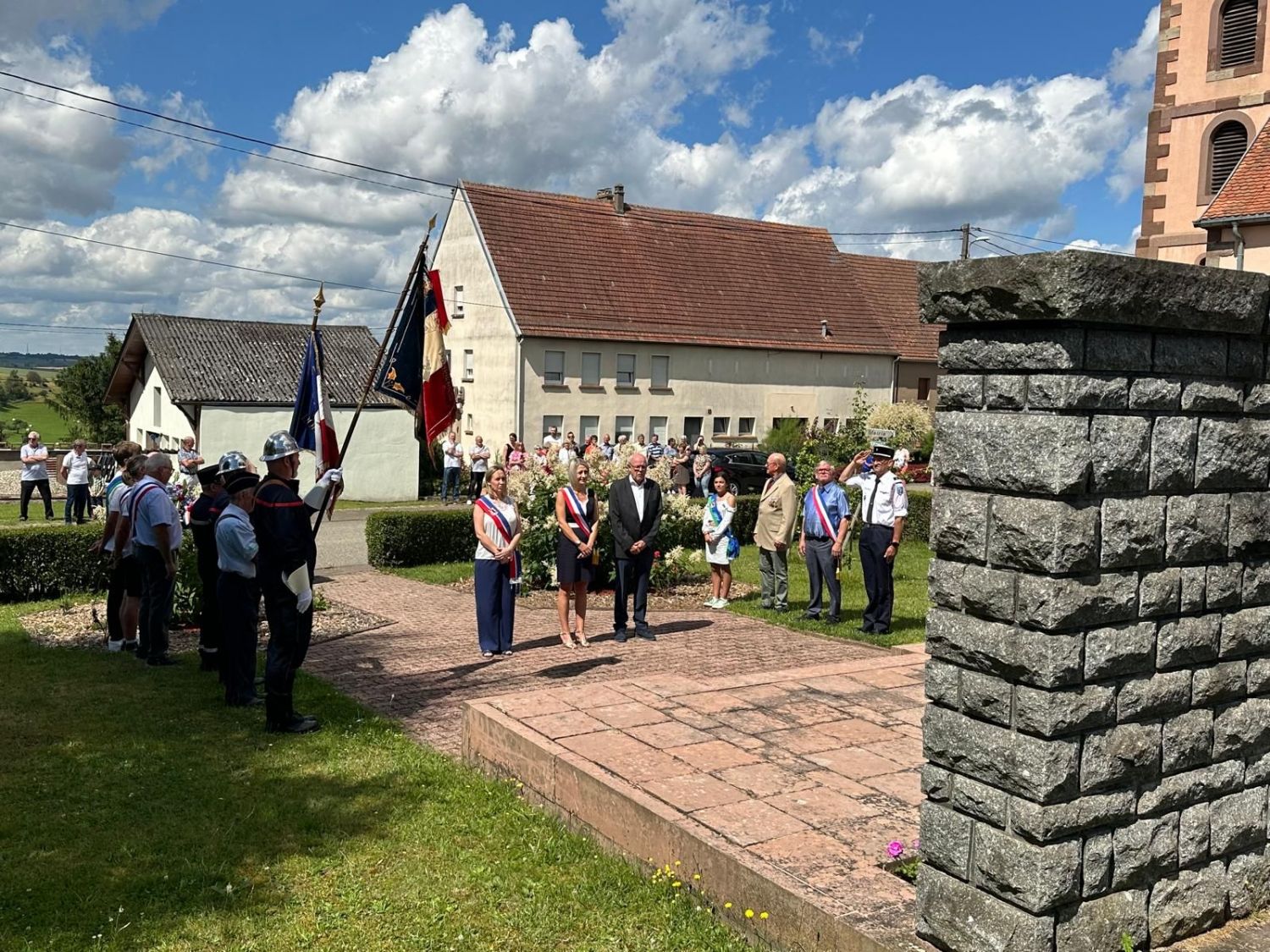 En présence des élus locaux, de représentants des pompiers, d’anciens combattants et des conseillers départementaux juniors, la maire Cathia Heim accompagnée de Sophie Pastor, conseillère départementale a procédé au dépôt de gerbes au pied du monument. L’accompagnement musical était assuré par la batterie fanfare de Schweyen.