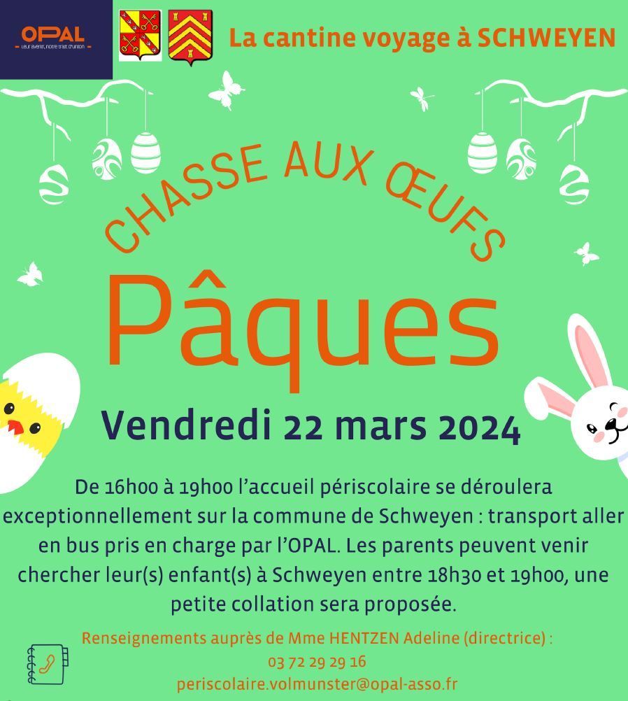 Schweyen Chasse aux oeufs Pâques 2024 22 mars 2024 Inscription obligatoirePlus d'informations ici : flyer-chasse-aux-oeufs-de-PA-ques-Schweyen.pdf