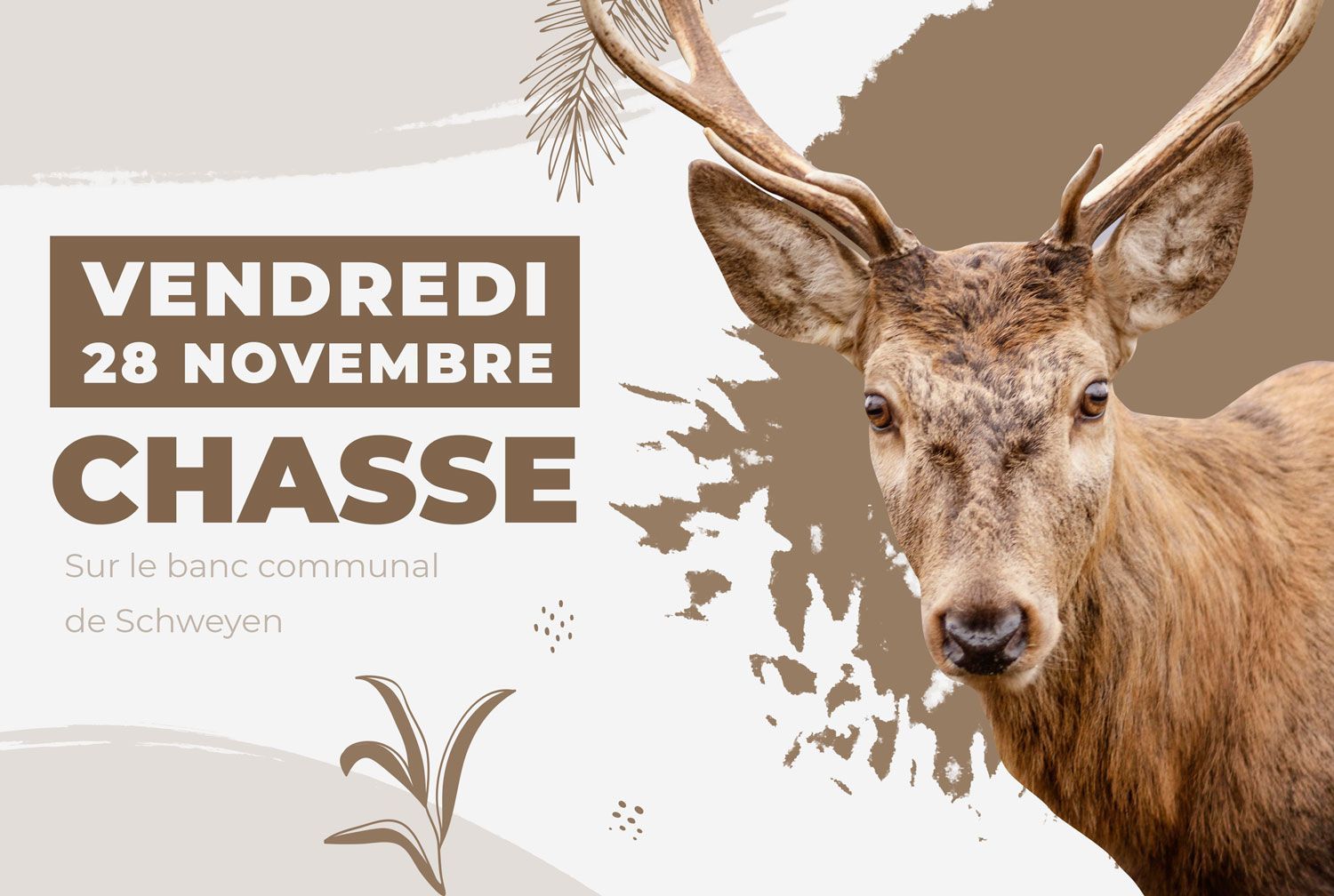 Schweyen Information importante : Chasse 2025 28 nov. 2025 Lieu : Banc communal Une battue de chasse aura lieu le vendredi 28 novembre sur le banc communal. Pour plus d'informations sur "Information importante : Chasse", n'hésitez pas à contacter l'association organisatrice ou à défaut, la mairie.