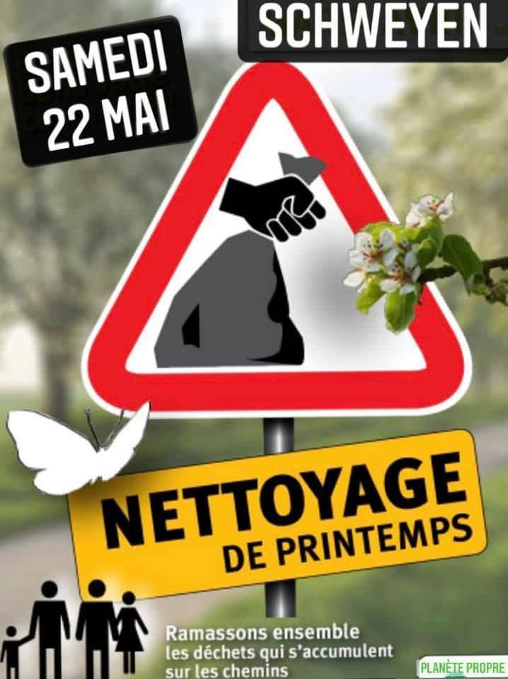 Schweyen Journée Nettoyage de printemps La commune organise une journée de nettoyage le samedi 22 mai 2021 à 9h.Toute personne souhaitant participer à cette opération peut s’inscrire en mairie avant le lundi 17 mai 2021.Merci d’avance pour votre participation 5 mai 2021